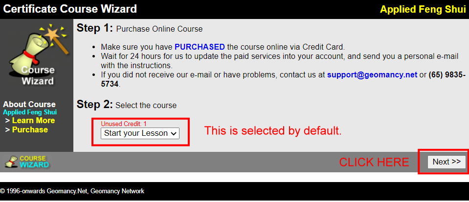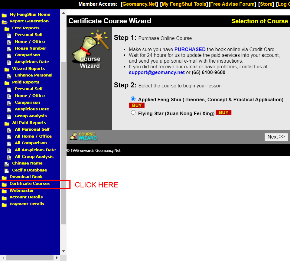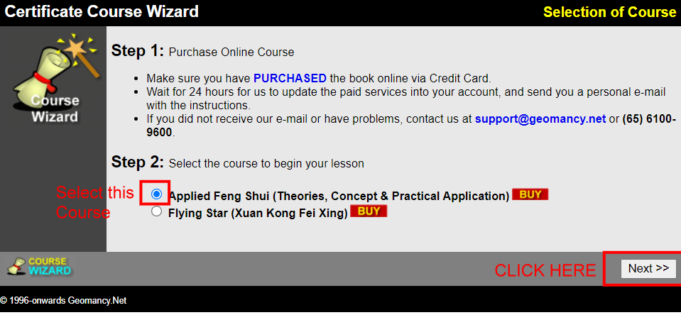 • Select the Applied Feng Shui (Theories, Concept & Pratical Application) course and click on Next.